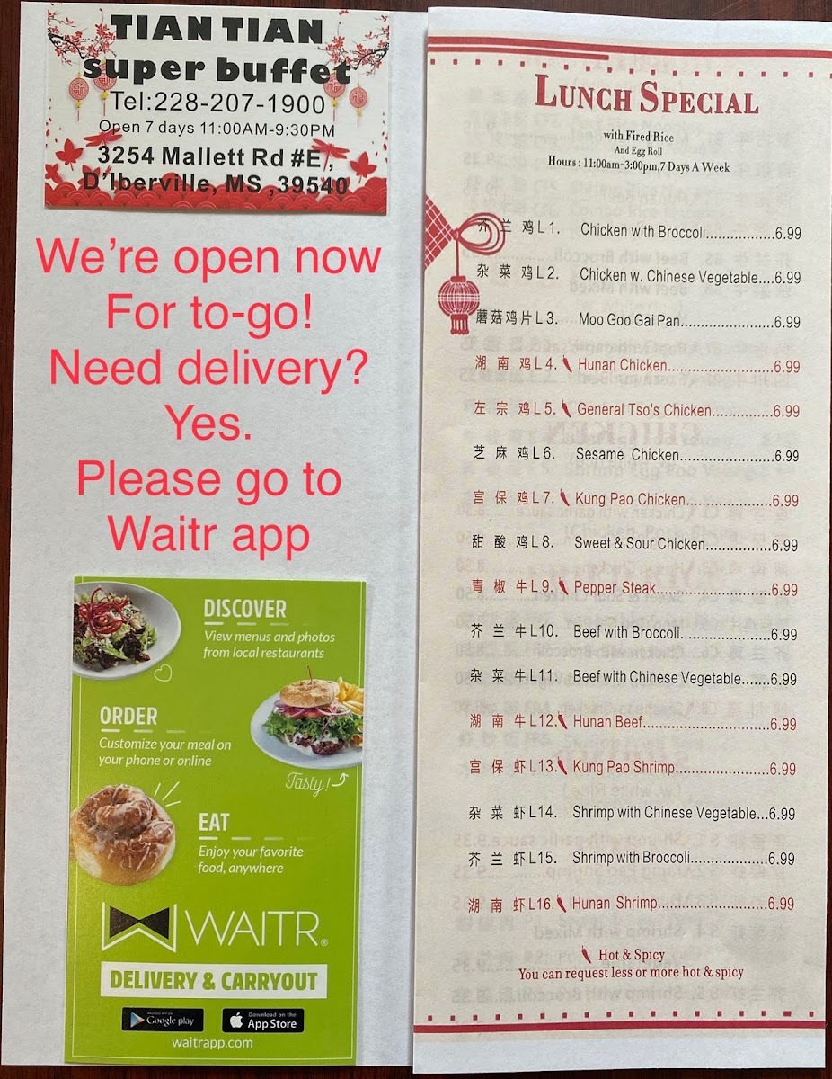 Welcome to Tiantian Super Buffet, a delightful Chinese buffet located at 3254 Mallett Rd, D'Iberville, MS. Here, an extensive menu invites all food lovers to indulge in a culinary adventure. The buffet showcases a range of flavorful beef dishes, including Beef with Broccoli and Mongolian Beef, each served with fluffy white rice for just $13.99.